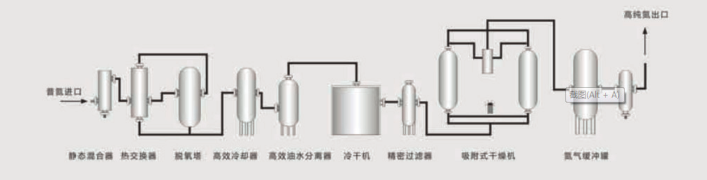 接着经过热交换器,再进入干燥过滤装置脱除水、二氧化碳及尘粒等杂质,从而获得高纯氮气。