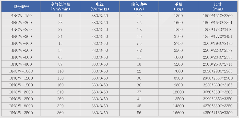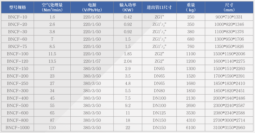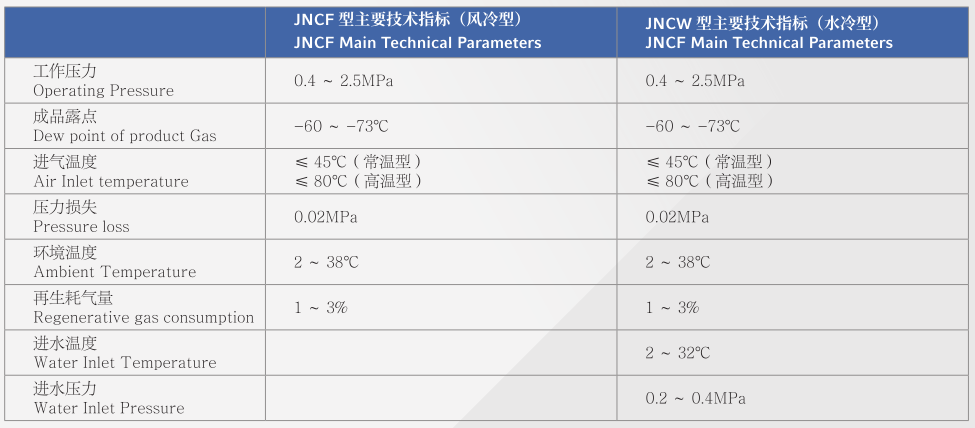 注:以上数据以 0.8Mpa(G)原料空气,环境温度 20℃ ,0 米标高和 80% 相对湿度为设计基准。